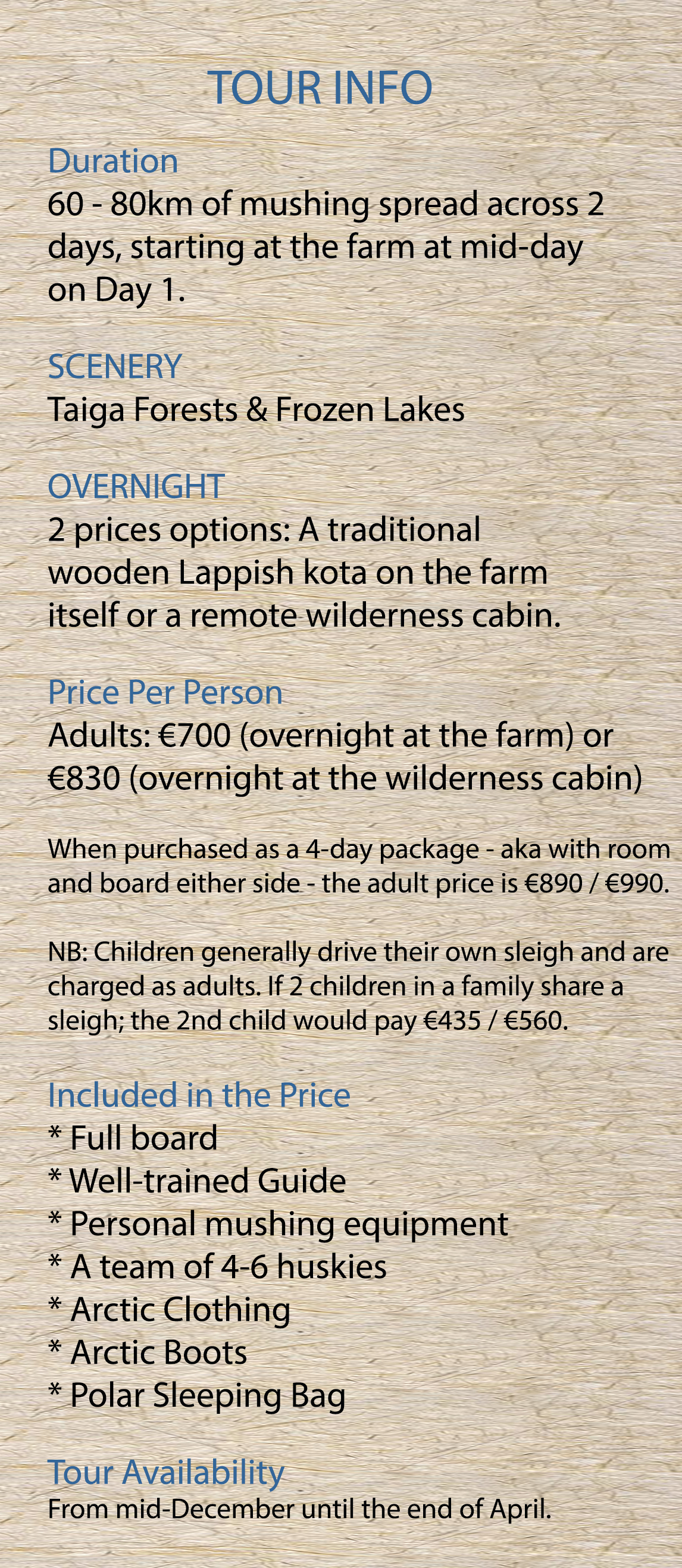 Price as a 4-day Package: Adults Solo Sleigh Price €890 (farm log-kota) / €990 (wilderness cabin), Children €600/ €700