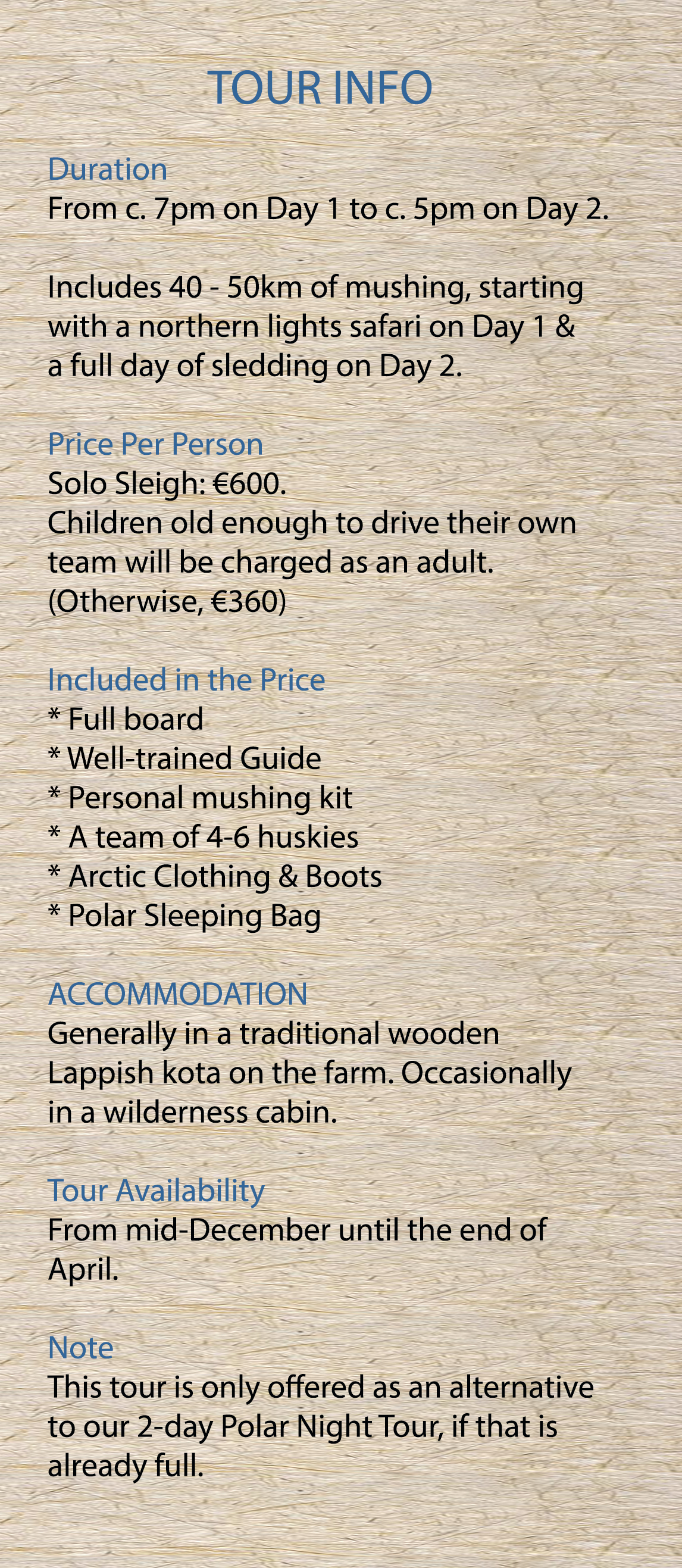 Preis beinhaltet: Geführter Farmbesuch, Snacks, Abendessen und Frühstück, Übernachtung in einer Kota oder gegebenenfalls in einer Wildnisütte und ca. 40 bis 50 km Schlittenhundefahrt.