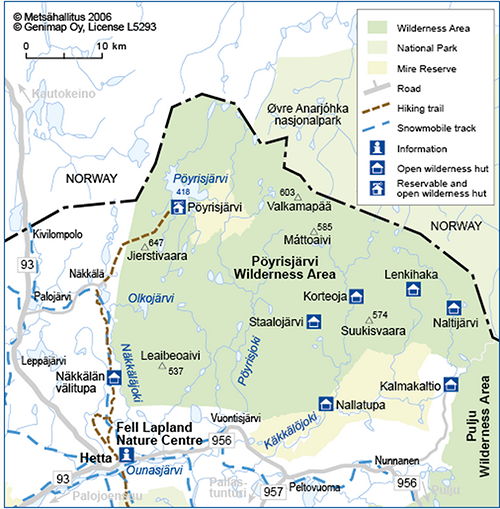 Pöyrisjärvi Wilderness Area is located on the north-side of road 956, which runs from the village of Hetta through Nunnanen to Kittilä, and on the east-side of road 93, which runs from Hetta to northern Norway. The northern boundary of the wilderness area runs along the Finland/Norway border.