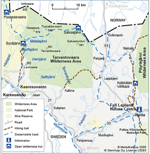 Tarvantovaara Wilderness Area is located in the middle of the municipality of Enontekiö. Main road 21 (E 8) runs just outside the wilderness area’s southern boundary. The village of Kultima is located next to the southern boundary. Road 93 (Hetta- Kautokeino) is to the east of the area and leads through the villages of Leppäjärvi and Palojärvi. All of these villages are good access points for this area but you need to start from Kaaresuvanto if you want to hike the Kaaresuvanto-Syväjärvi Trail. The northern boundary of the wilderness area follows the Finnish-Norwegian border and there is a wild hiking / biking trail which isn't shown on the map below which starts from Palojarvi and crisscrosses the Norwegian border between there and Salvasjärvi before turning south to Kuttanen.