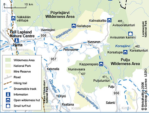Sauli KoskiPulju Wilderness Area is known for its large mires and its numerous hills and fells. It is a perfect destination for experienced trekkers. During late summer the area’s abundant cloudberry crop attracts day trip visitors to its mires. A rather large road runs through the centre of the wilderness area so it is a very convenient and easy-to-reach target for those cloudberry pickers with orienteering skills. A road and snowmobile track run through the area from the village of Nunnanen to the village of Pulju. Pulju Wilderness Area is surrounded by several protected areas. Lemmenjoki National Park lies to its east and Pöyrisjärvi Wilderness Area to its northwest. The northern boundary of the wilderness area follows the Finnish-Norwegian border. Øvre Anarjohka National Park (www.dirnat.no) is on the Norwegian side of the border.